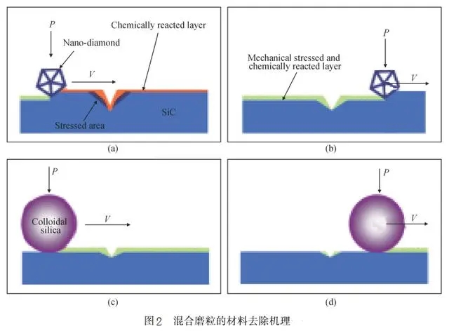 Park等將ZrO2磨粒與SiO2磨粒進行混合,Lee等將納米金剛石磨粒與SiO2磨?;旌希梢蕴嵘齋iO2磨粒的研拋效率。在混合磨粒中,隨著納米金剛石磨粒濃度的增加,材料的研拋效率也同步增加;在研拋過程中,納米金剛石磨粒主導工件表面材料的去除,SiO2磨粒則負責殘留機械加工痕跡的去除。